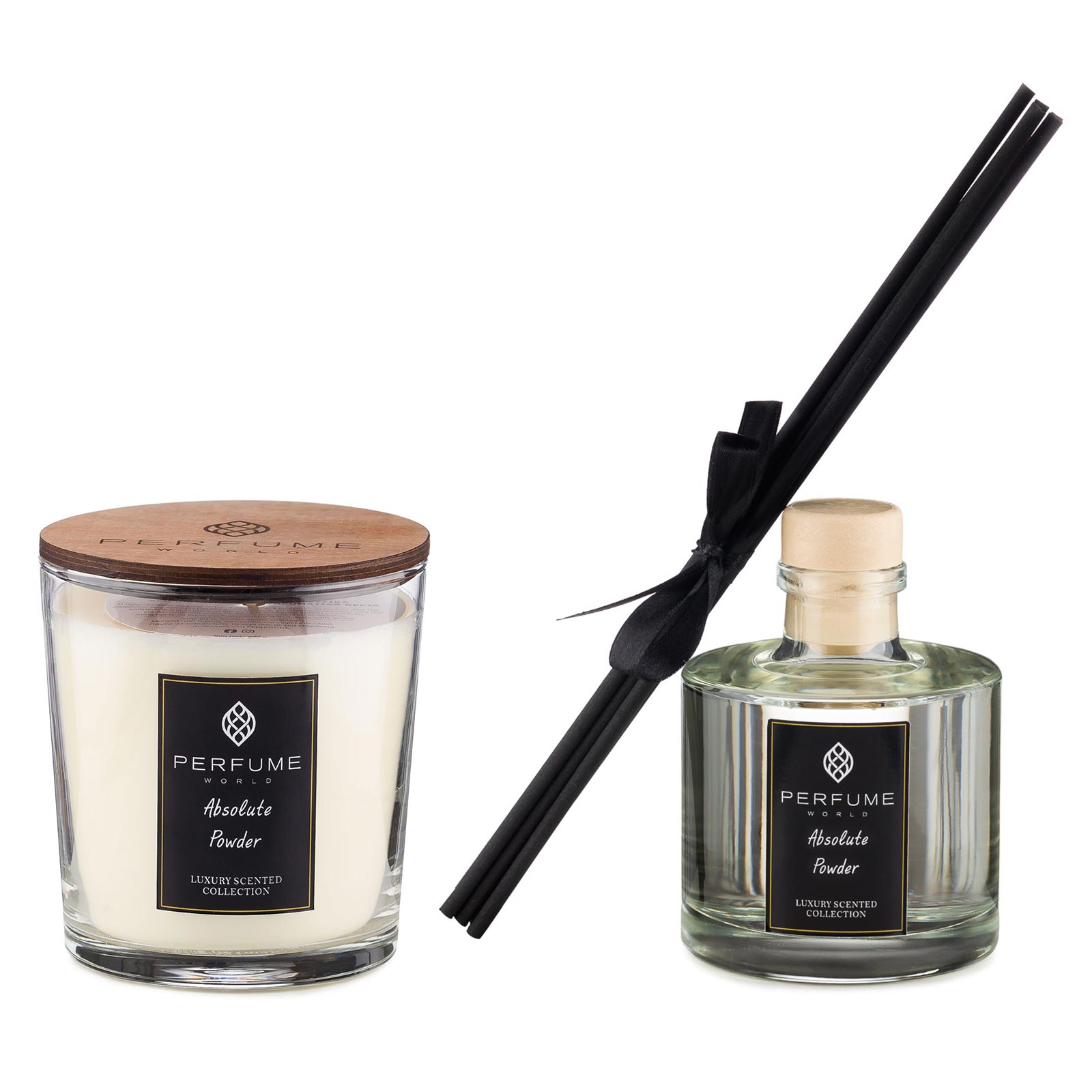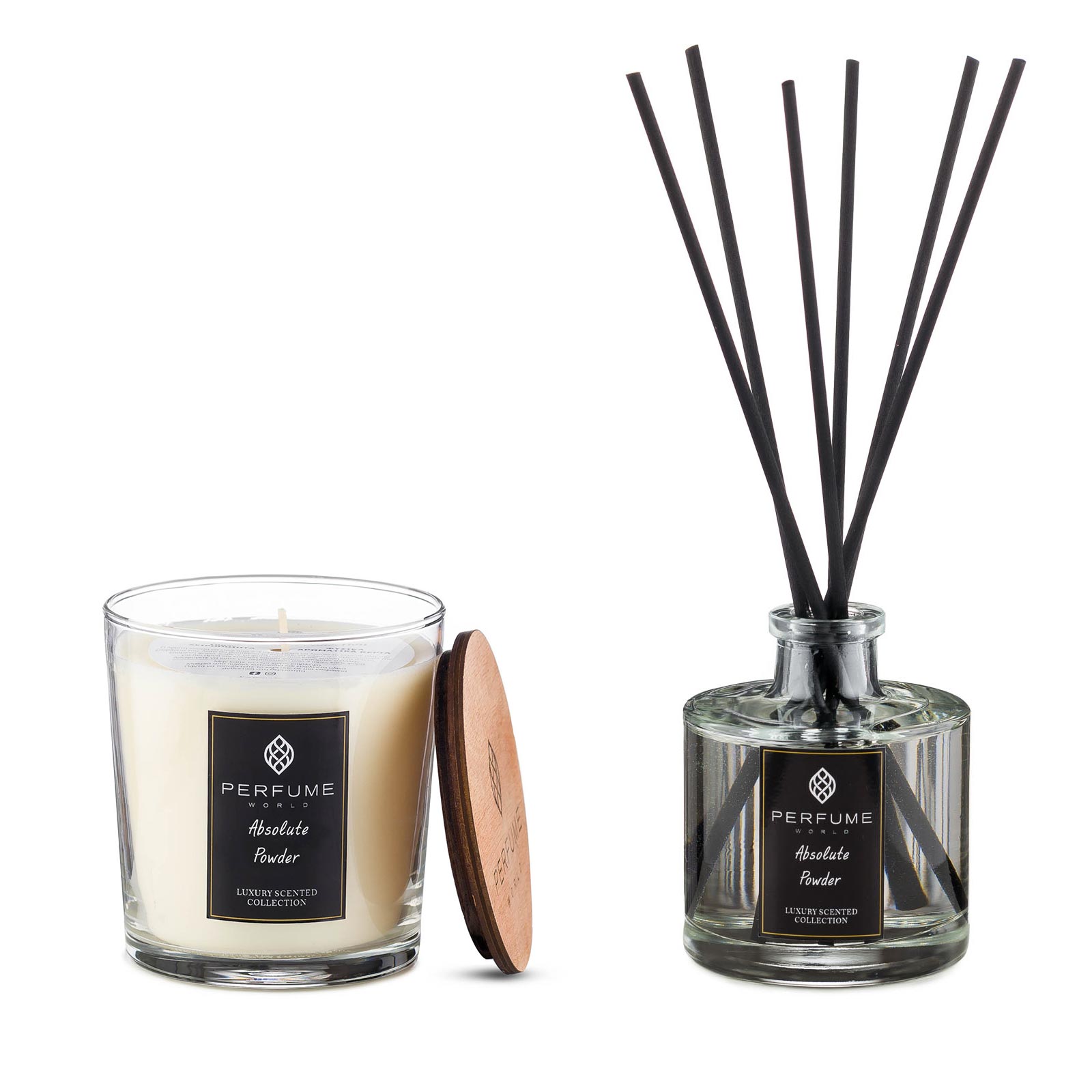 The set includes a 340g scented candle and a 200ml reed diffuser, along with 6 fibre bamboo sticks.