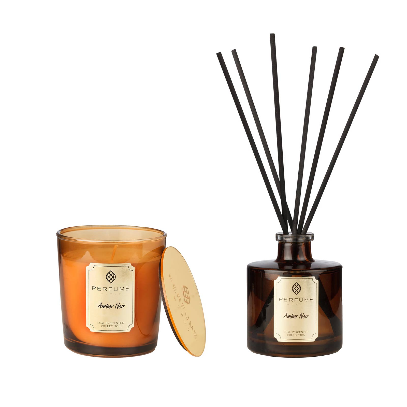The set includes a 340g scented candle and a 200ml reed diffuser, along with 6 fibre bamboo sticks.