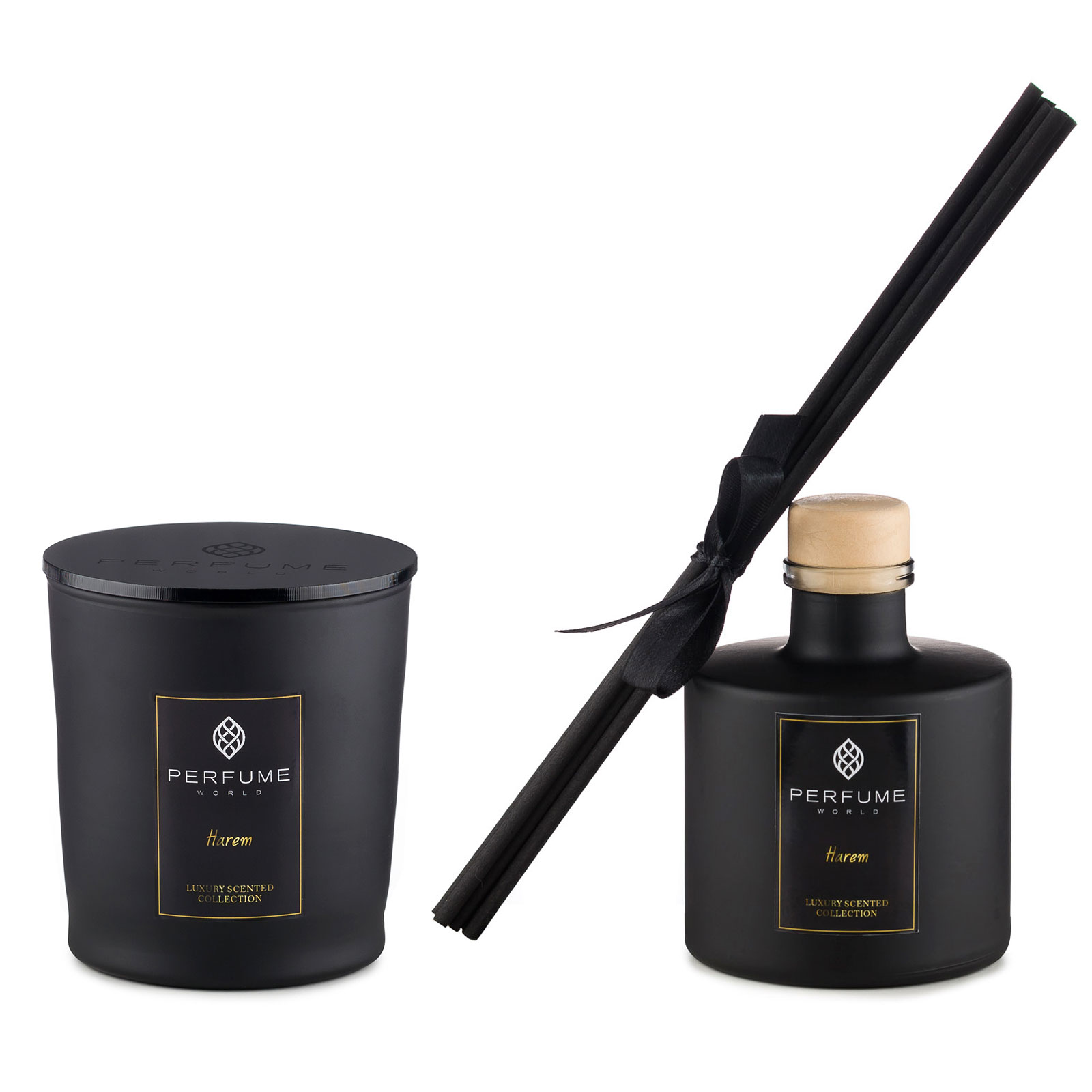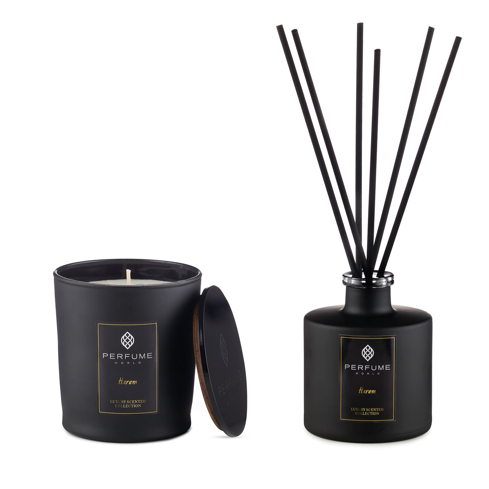 The set includes a 340g scented candle and a 200ml reed diffuser, along with 6 fibre bamboo sticks.